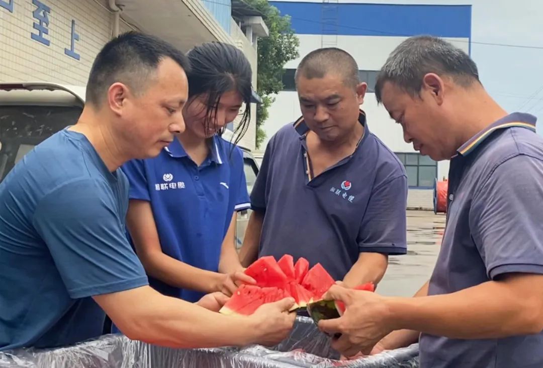 面對(duì)高溫天氣,湘聯(lián)電纜領(lǐng)導(dǎo)高度重視員工生命安全,并采取多項(xiàng)措施幫助員工應(yīng)對(duì)高溫生產(chǎn)工作,如配備防暑降溫的藿香正氣水、涼茶等物品,同時(shí)堅(jiān)持開(kāi)展夏日送西瓜的員工福利活動(dòng),預(yù)防高溫中暑。