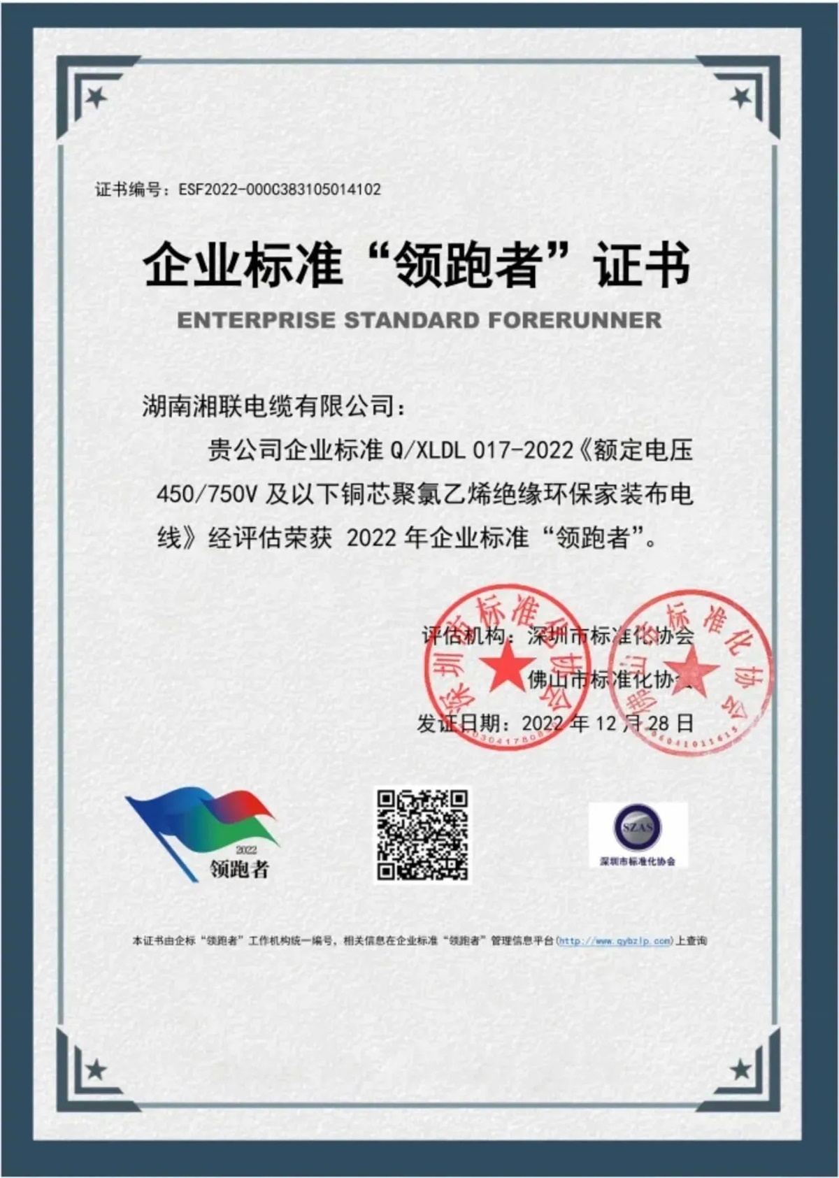自成立以來,湘聯電纜以“質量是發展的基石,是客戶信任的唯一理由”為指導,將產品質量視為企業生命線,不斷引進國內一流的電線電纜生產和檢測設備,以科學的經營管理理念,組建實力雄厚的技術研發和企業管理團隊,建立高標準質量管理體系,對生產全過程實現智能化數字化管理,公司產品先后通過國家強制性產品認證(CCC認證),榮獲企業標準“領跑者”等榮譽稱號,獲得用戶的廣泛認可。