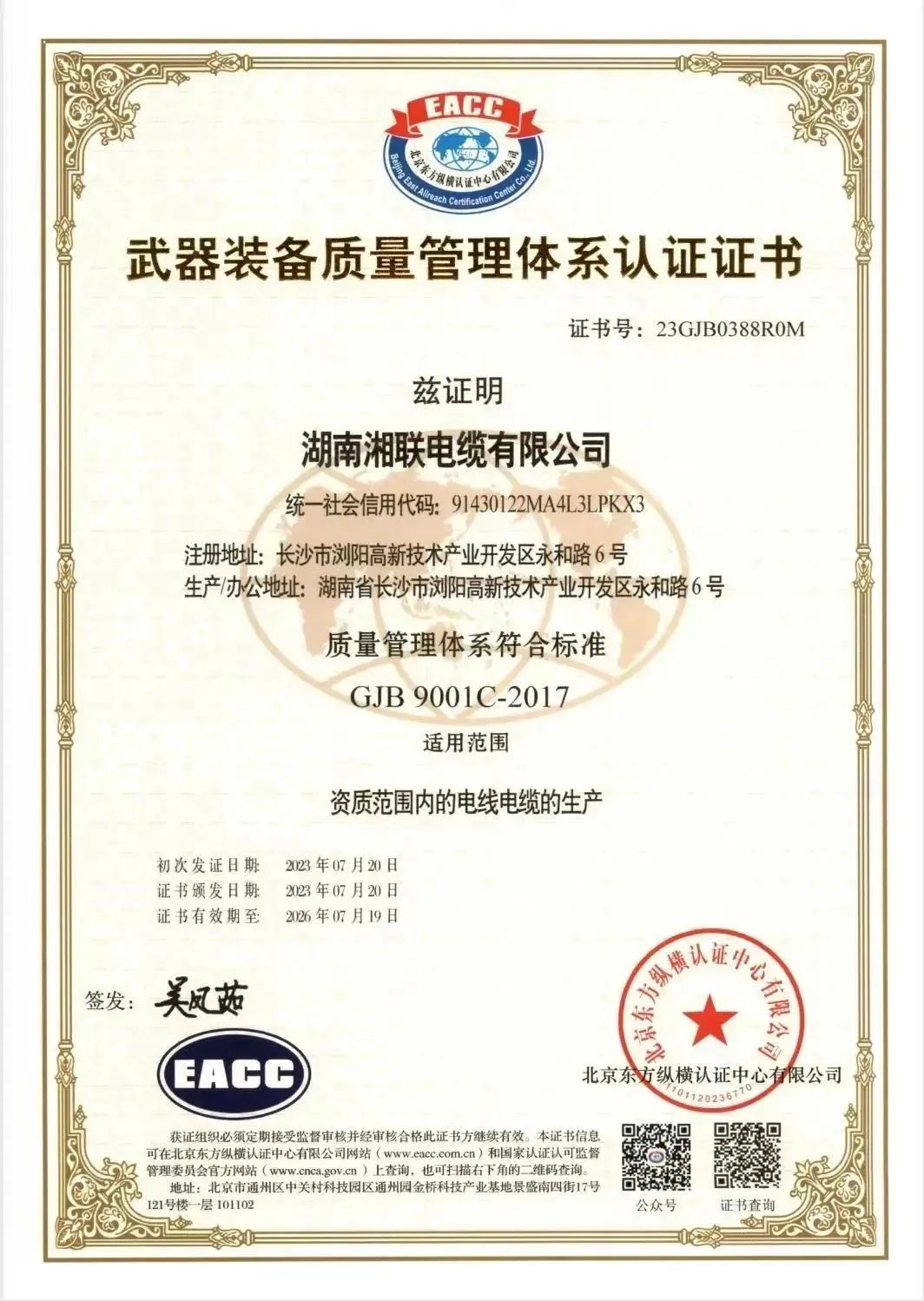 7月20日,湖南湘聯電纜有限公司順利通過國軍標質量管理體系認證,獲得《武器裝備質量管理體系認證證書》,質量管理體系符合:GJB9001C-2017標準。