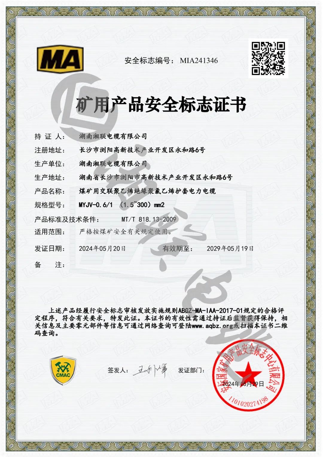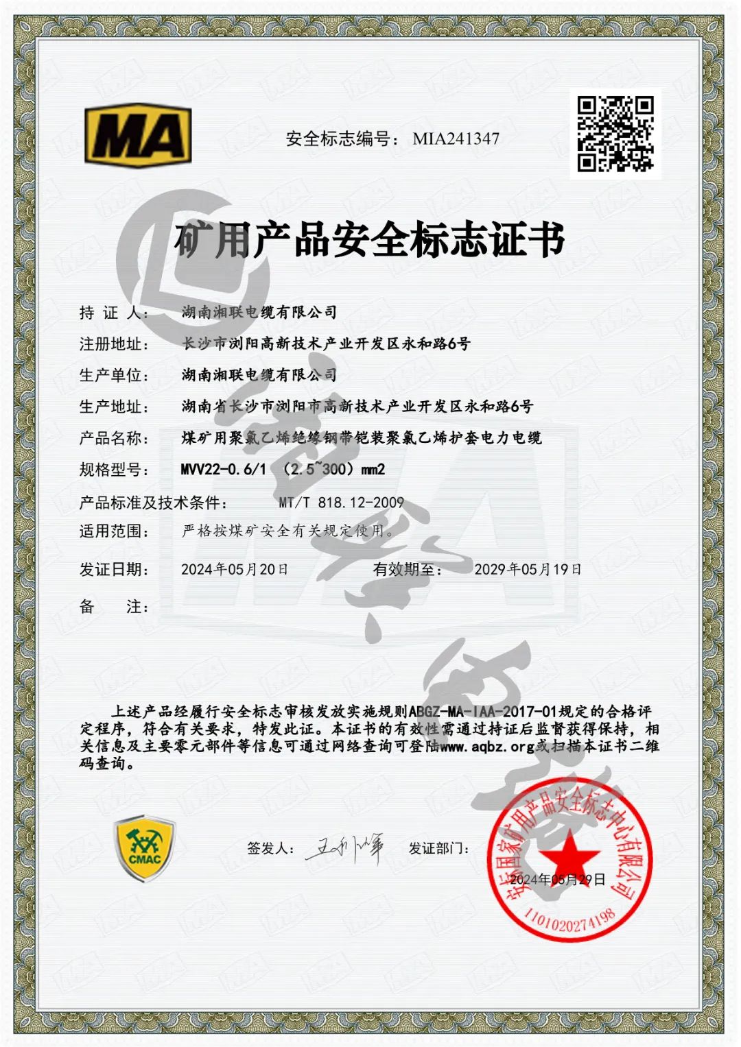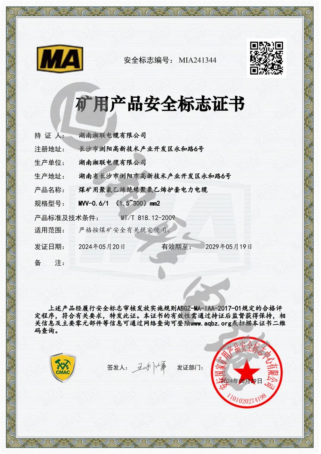 近日,湖南湘聯(lián)電纜有限公司成功取得安標國家礦用產品安全標志中心頒發(fā)MVV-0.6/1(1.5~300)mm2煤礦用聚氯乙烯絕緣聚氯乙烯護套電力電纜、MYJV-8.7/10(25~300)mm2煤礦用交聯(lián)聚乙烯絕緣聚氯乙烯護套電力電纜等六個產品的礦用產品安全標志證書。