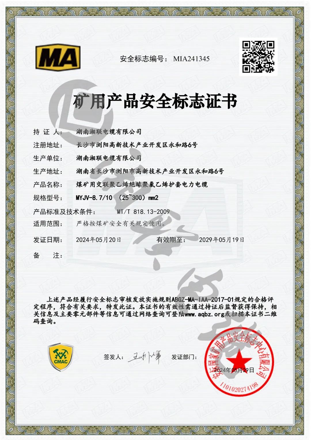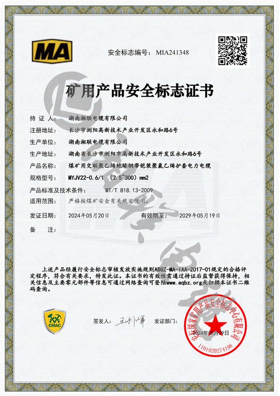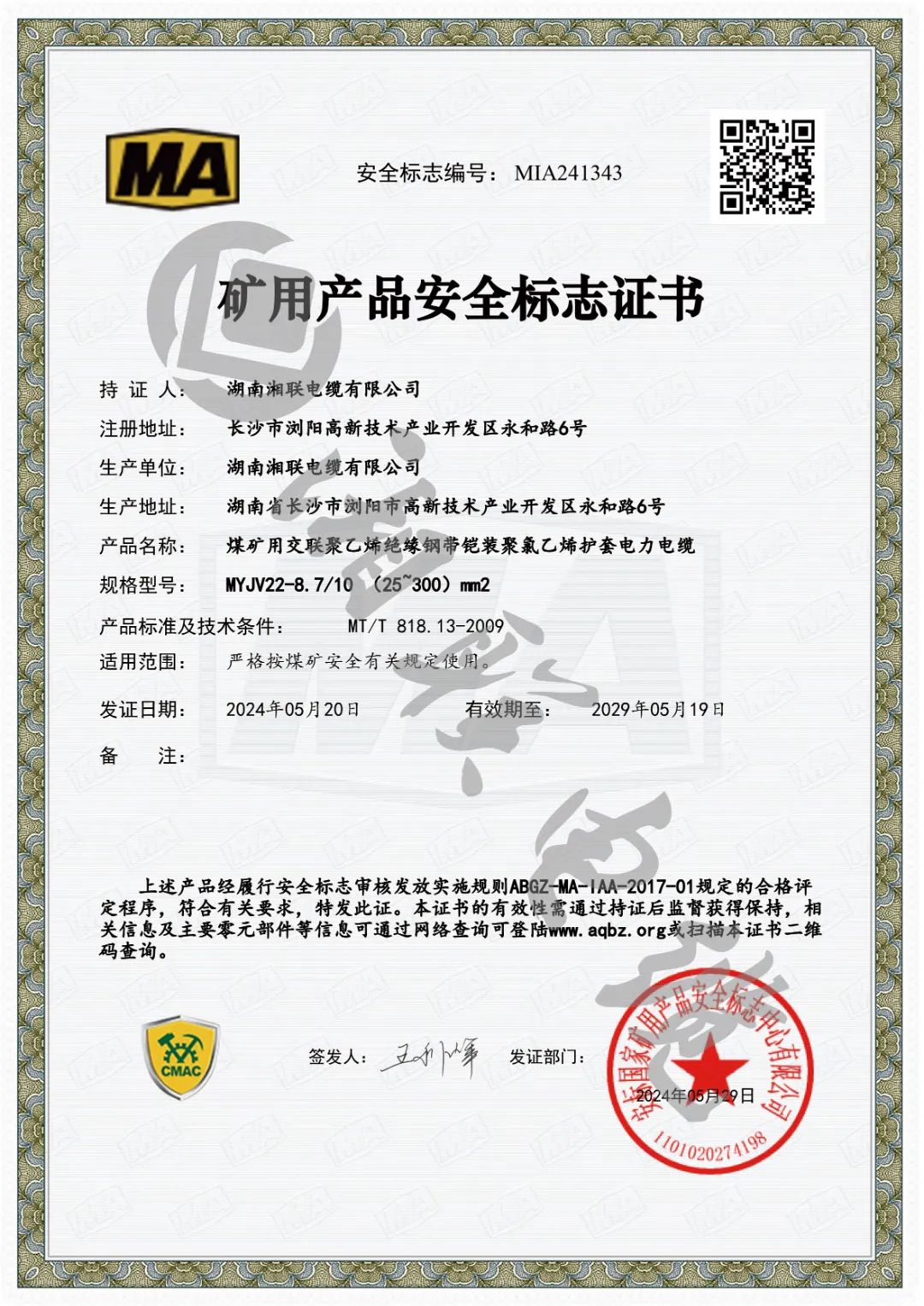 近日,湖南湘聯(lián)電纜有限公司成功取得安標國家礦用產品安全標志中心頒發(fā)MVV-0.6/1(1.5~300)mm2煤礦用聚氯乙烯絕緣聚氯乙烯護套電力電纜、MYJV-8.7/10(25~300)mm2煤礦用交聯(lián)聚乙烯絕緣聚氯乙烯護套電力電纜等六個產品的礦用產品安全標志證書。