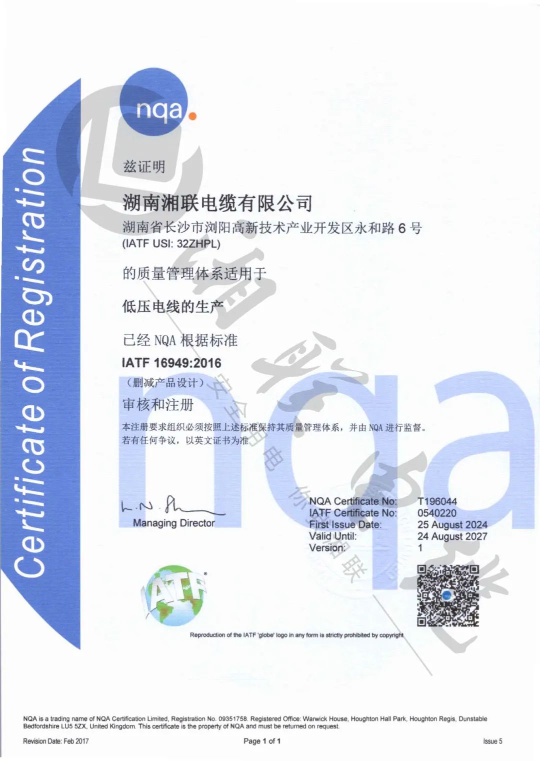 湘聯(lián)電纜通過(guò)IATF16949質(zhì)量管理體系認(rèn)證!